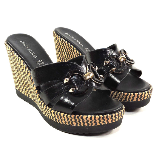 SPACE MODA BY REPO 🇮🇹 WOMEN'S BLACK SOFT LEATHER COMFORT WEDGE SUMMER MULES