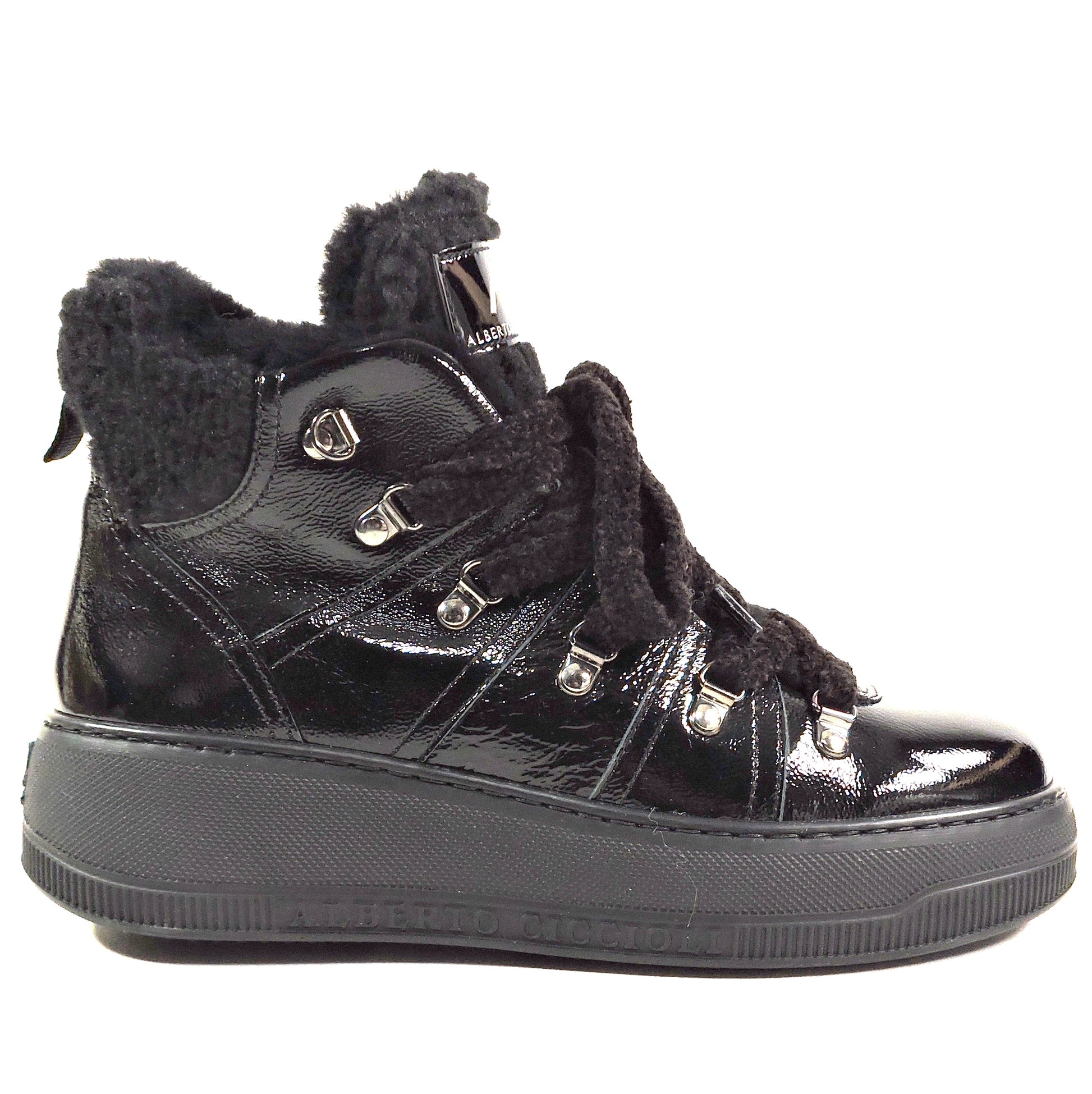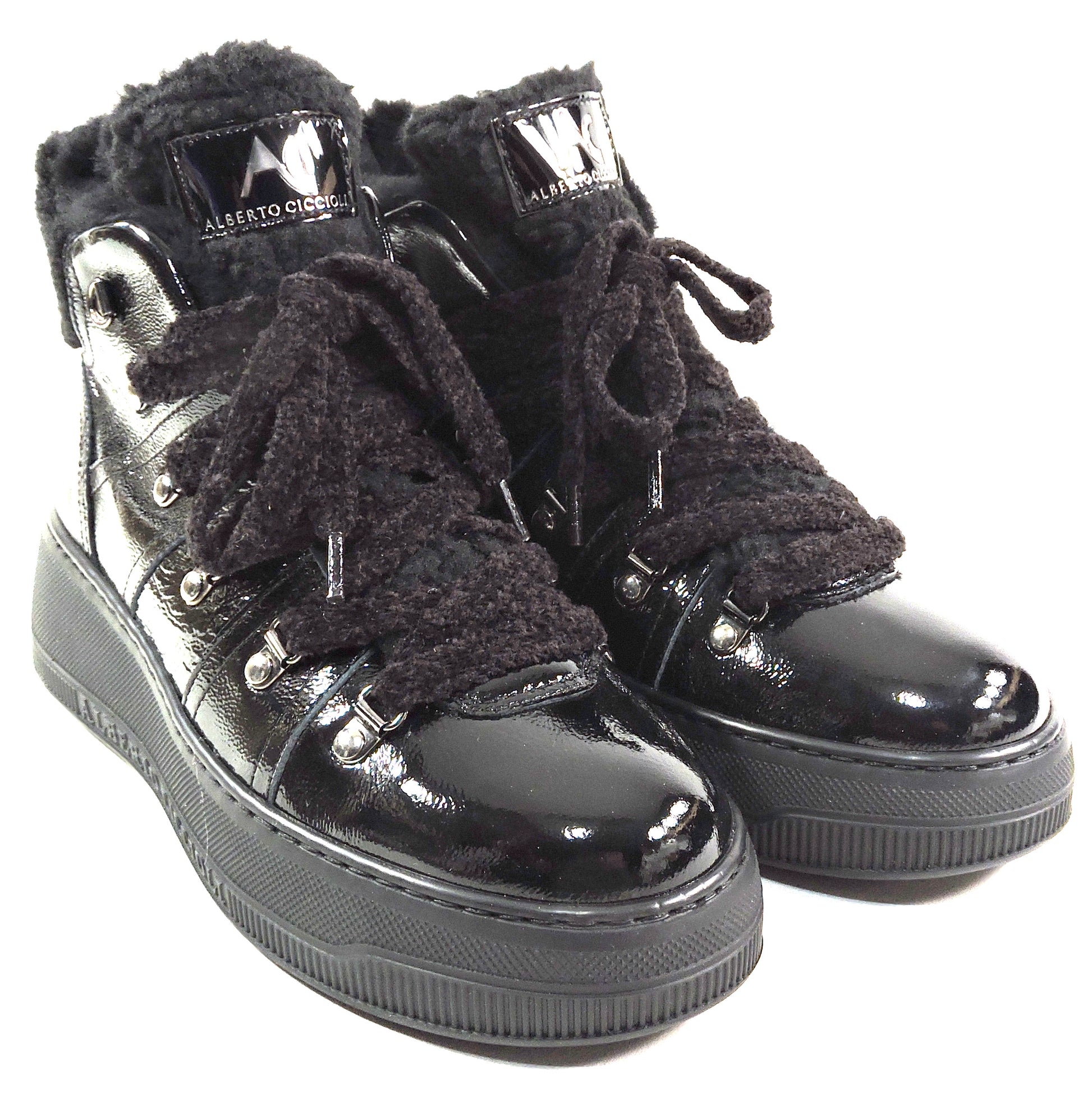 The Alberto Ciccioli women's black patent leather ankle comfort booties in size 37 EU are a stylish and versatile option for casual occasions during the winter season. With a round toe shape, lace-up closure, and flat heel, these booties provide comfort and support. Made with high-quality leather and featuring a cozy lamb fur lining, they are both fashionable and practical. The ankle shaft style and solid black color make them a versatile addition to any wardrobe, perfect for city living in style. Made in Italy with attention to detail, these booties are a reliable choice for the modern woman.