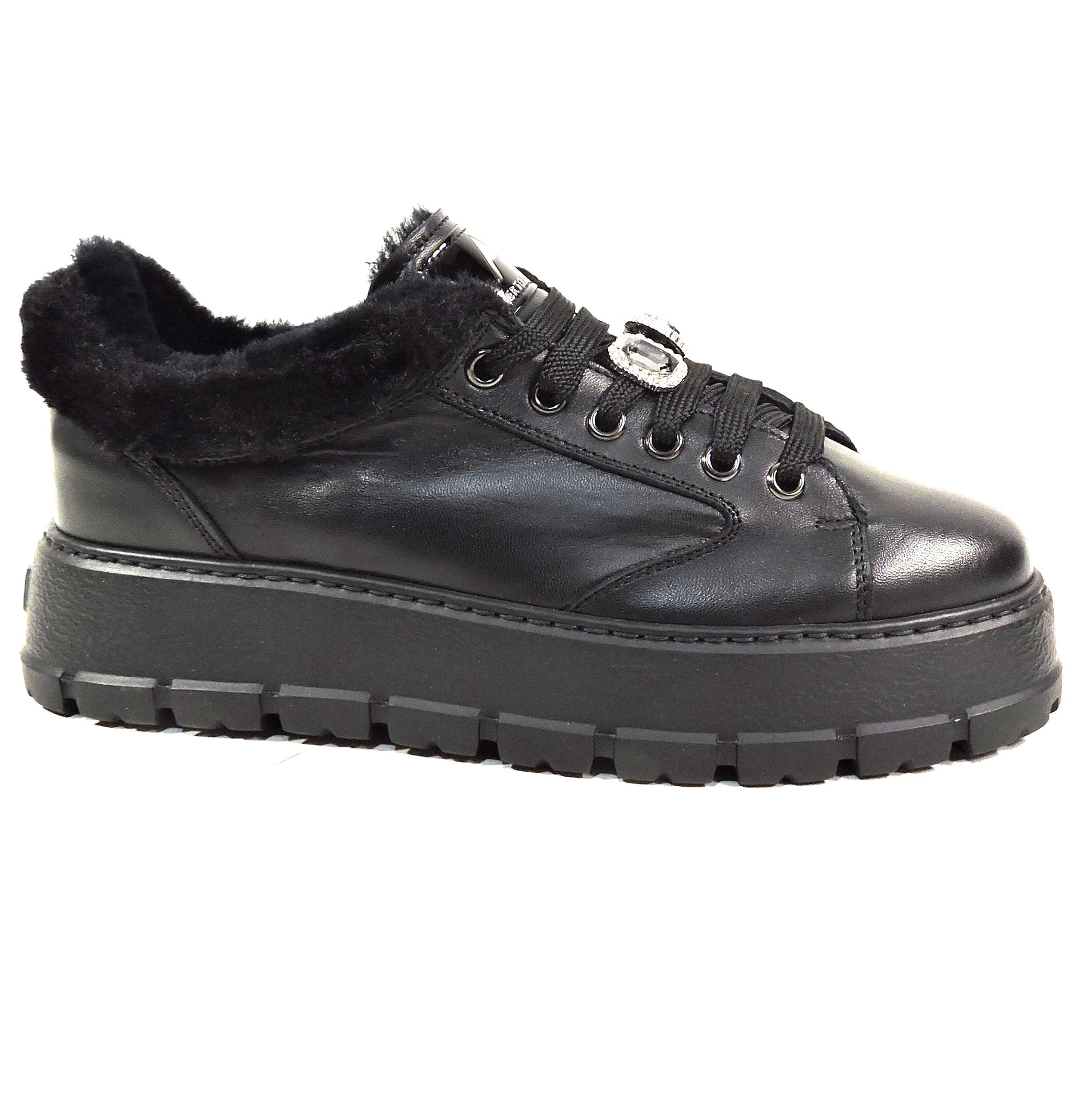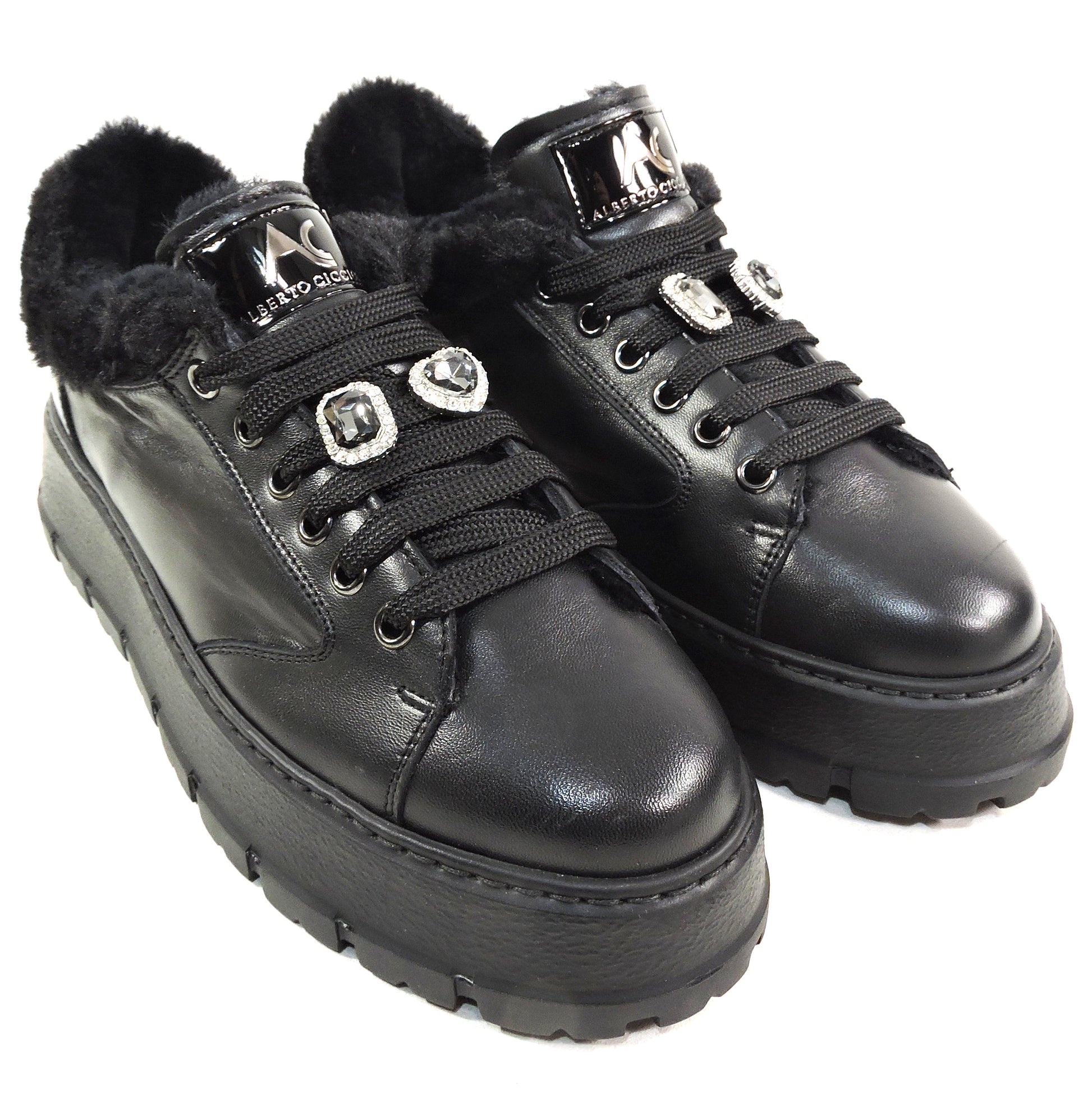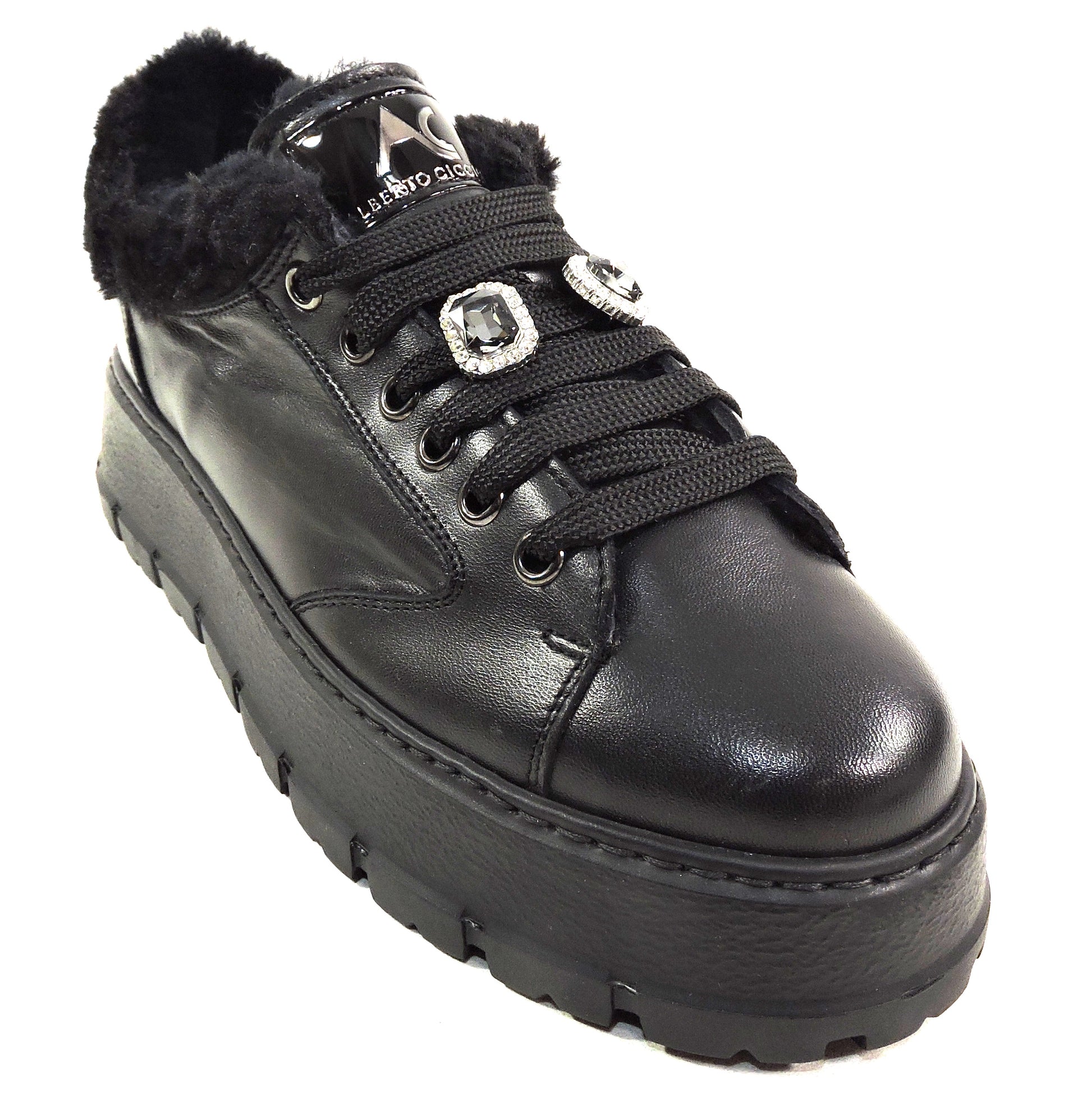The ALBERTO CICCIOLI Women's Black Soft Leather Comfort Winter Fashion Sneakers are a stylish and functional choice for the winter season. Made in Italy, these lace-up sneakers feature a rubber outsole for traction and a furry lining for added comfort. The black leather upper and logo accents add a touch of sophistication, while the low-top shoe shaft style and standard shoe width make them versatile for everyday wear. Perfect for activewear and walking, these sneakers combine fashion and function for a chic winter footwear option.