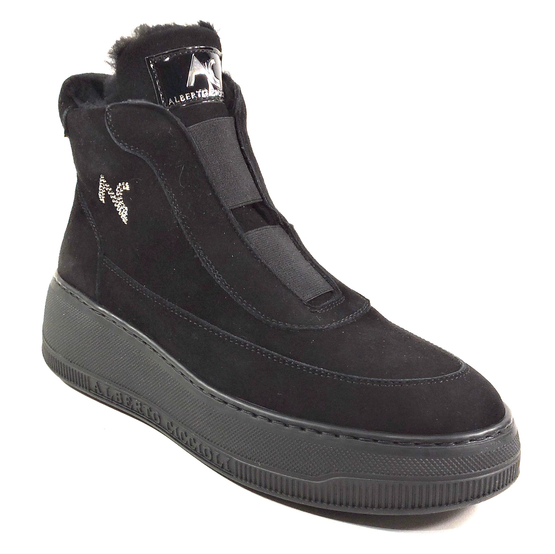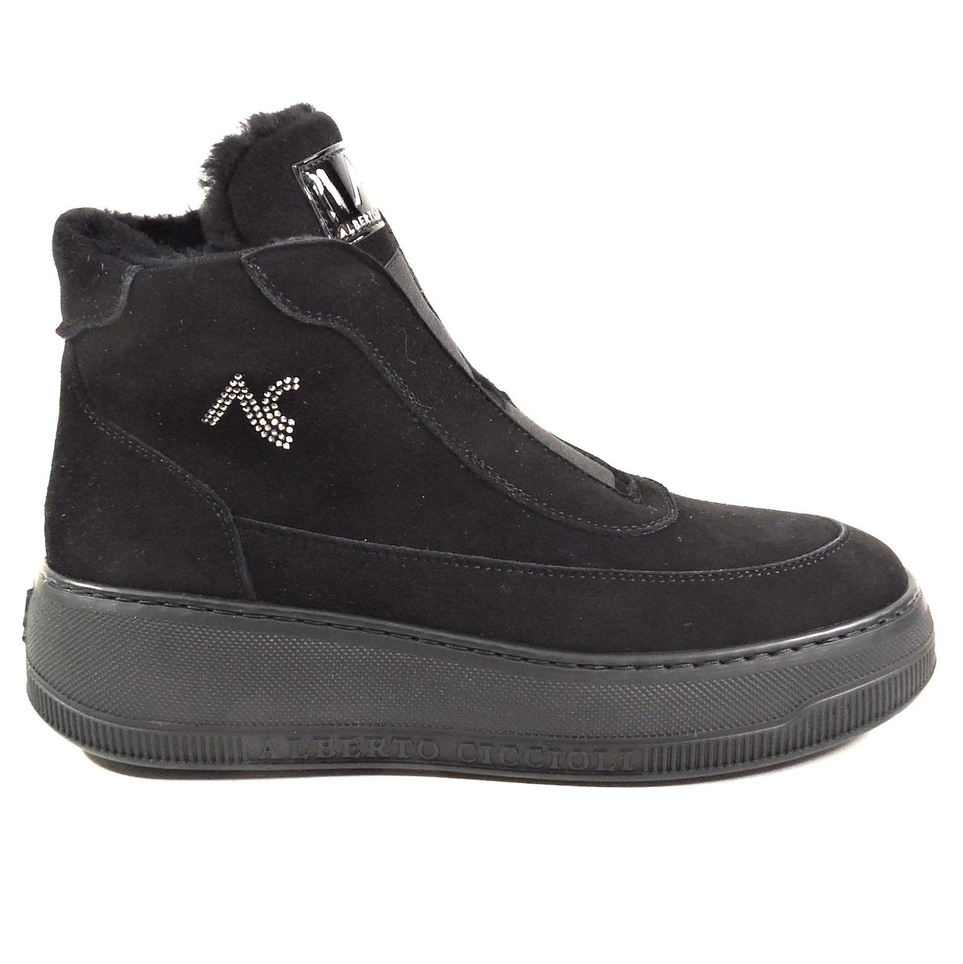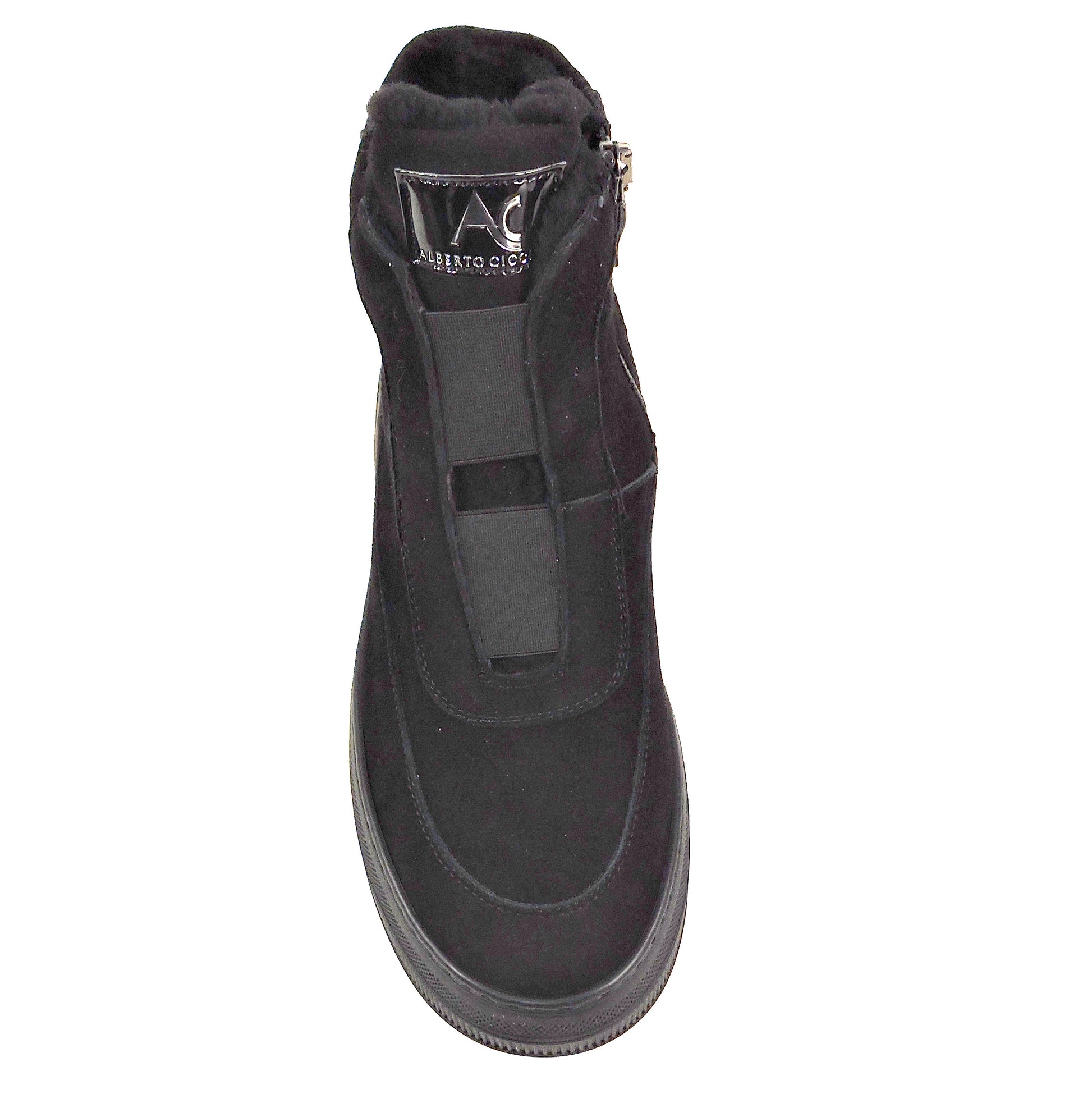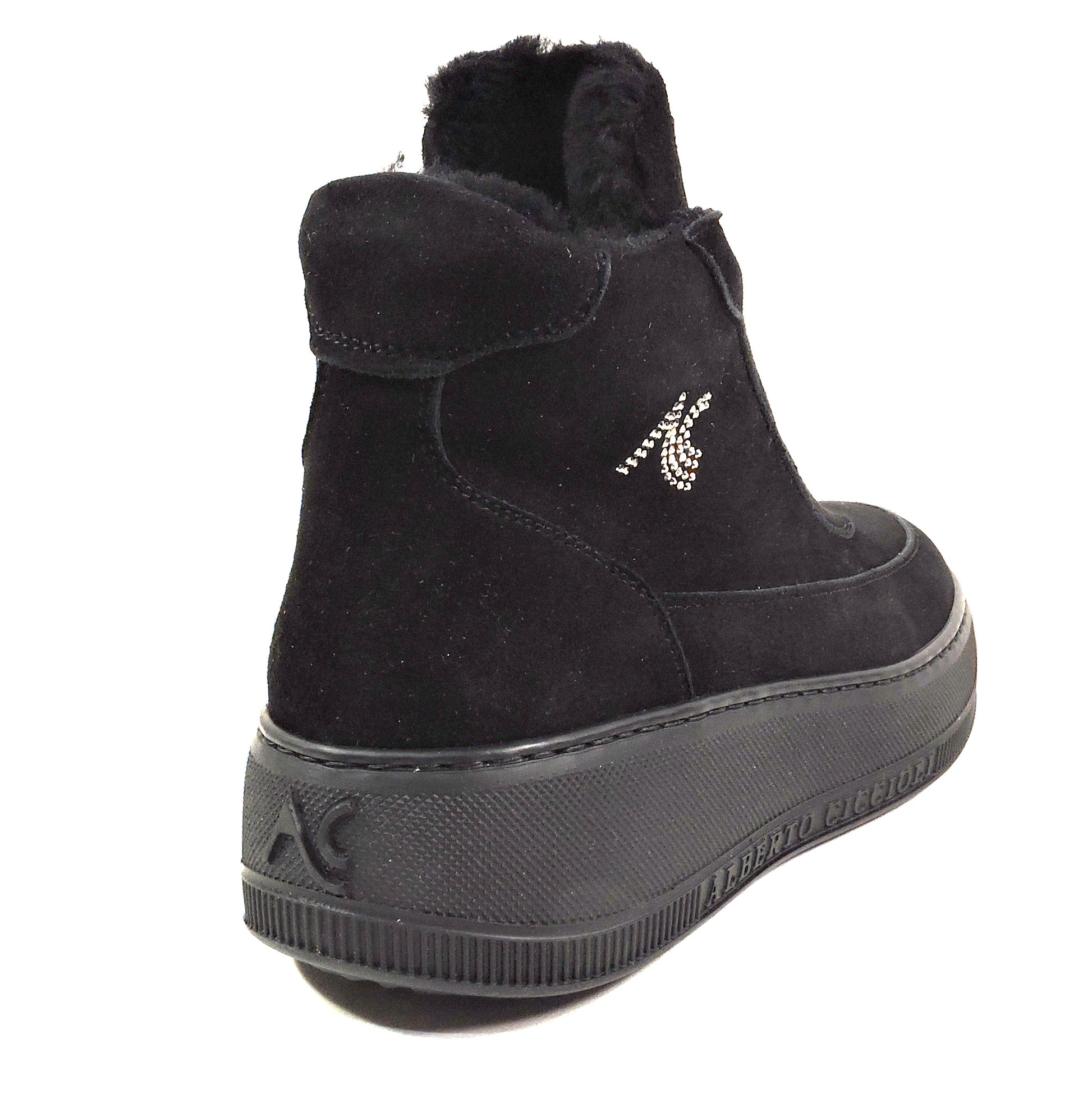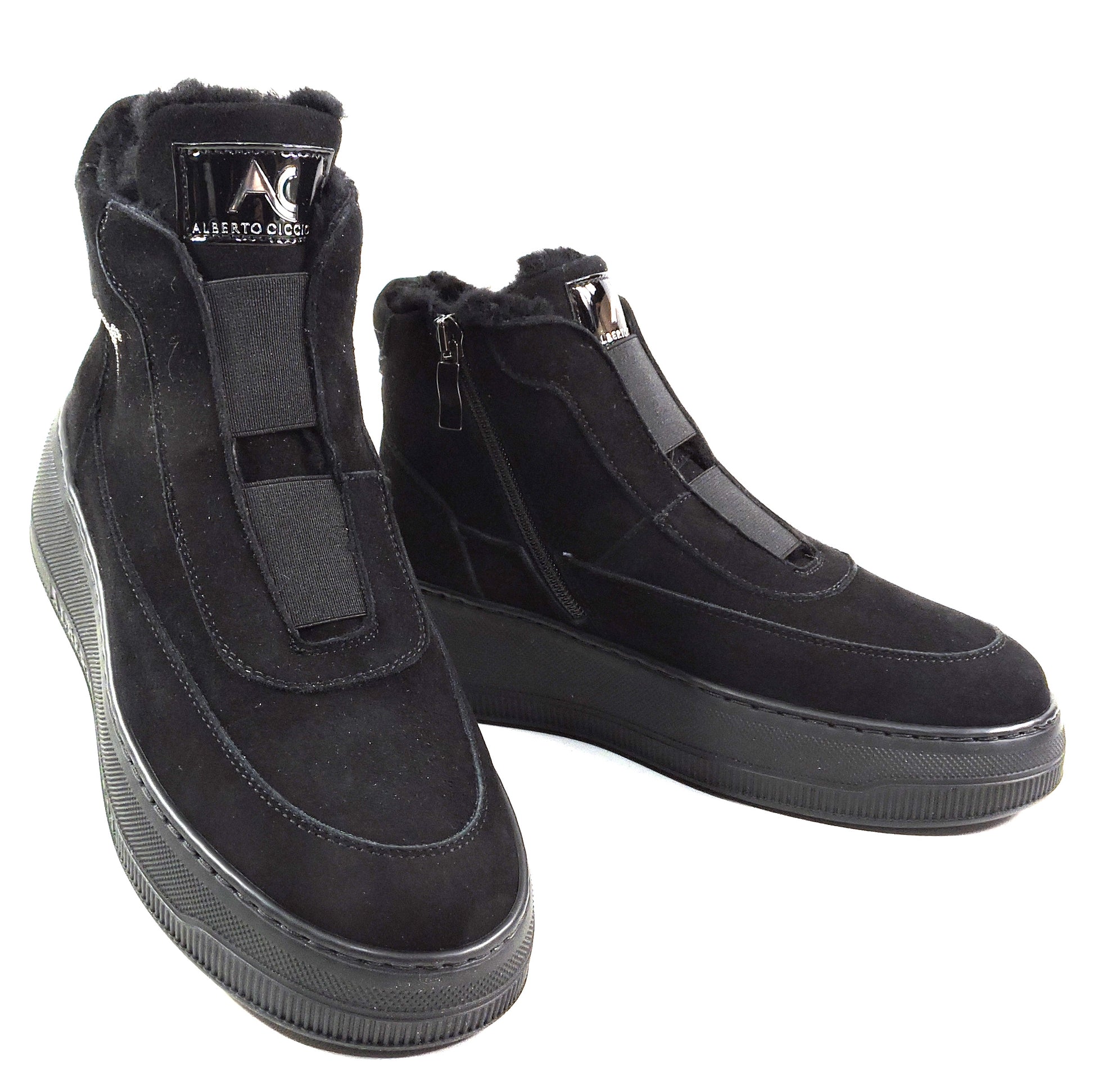 The Alberto Ciccioli women's black soft suede flat ankle winter booties in size 37 EU are a stylish and comfortable choice for the winter season. With a round toe shape, zip closure, and flat heel, these booties are perfect for casual occasions. The wide calf width and comfortable features make them a practical option, while the ankle shaft style and solid black color add a trendy touch. Made in Italy with a rubber outsole and lined with fur, these booties combine comfort and fashion in a versatile design. Ideal for the city, these booties are a must-have for any woman's winter wardrobe.