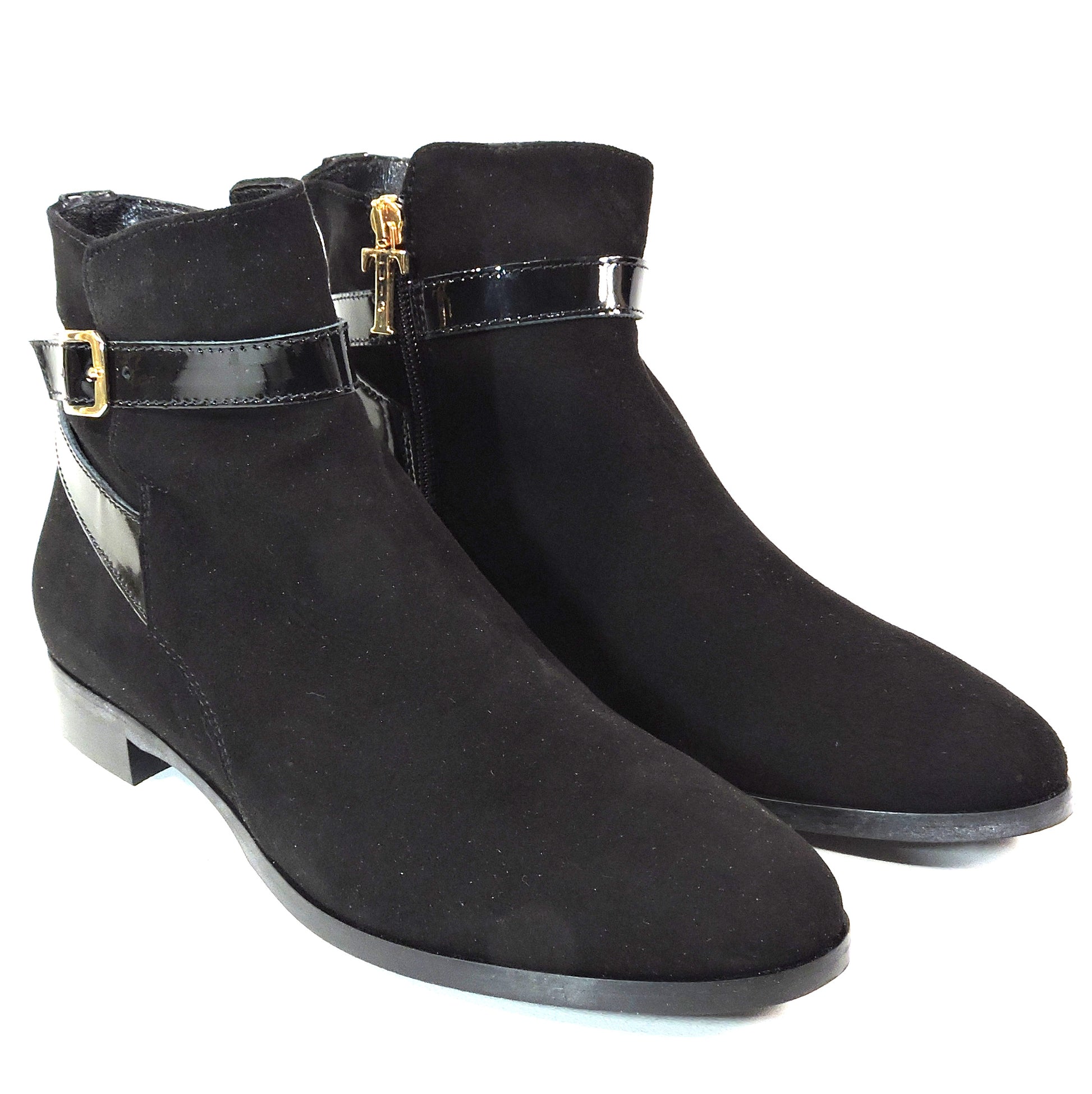 The Luigi Trani Women's Black Soft Suede Comfort Winter Booties are a stylish and versatile choice for the winter season. Made in Italy, these ankle boots feature a closed toe and zip closure for easy wear. The low heel and comfortable insole make them perfect for casual occasions, while the rubber outsole provides durability. The black suede material and leather lining add a touch of luxury to these classic booties, making them a must-have for any woman's wardrobe.