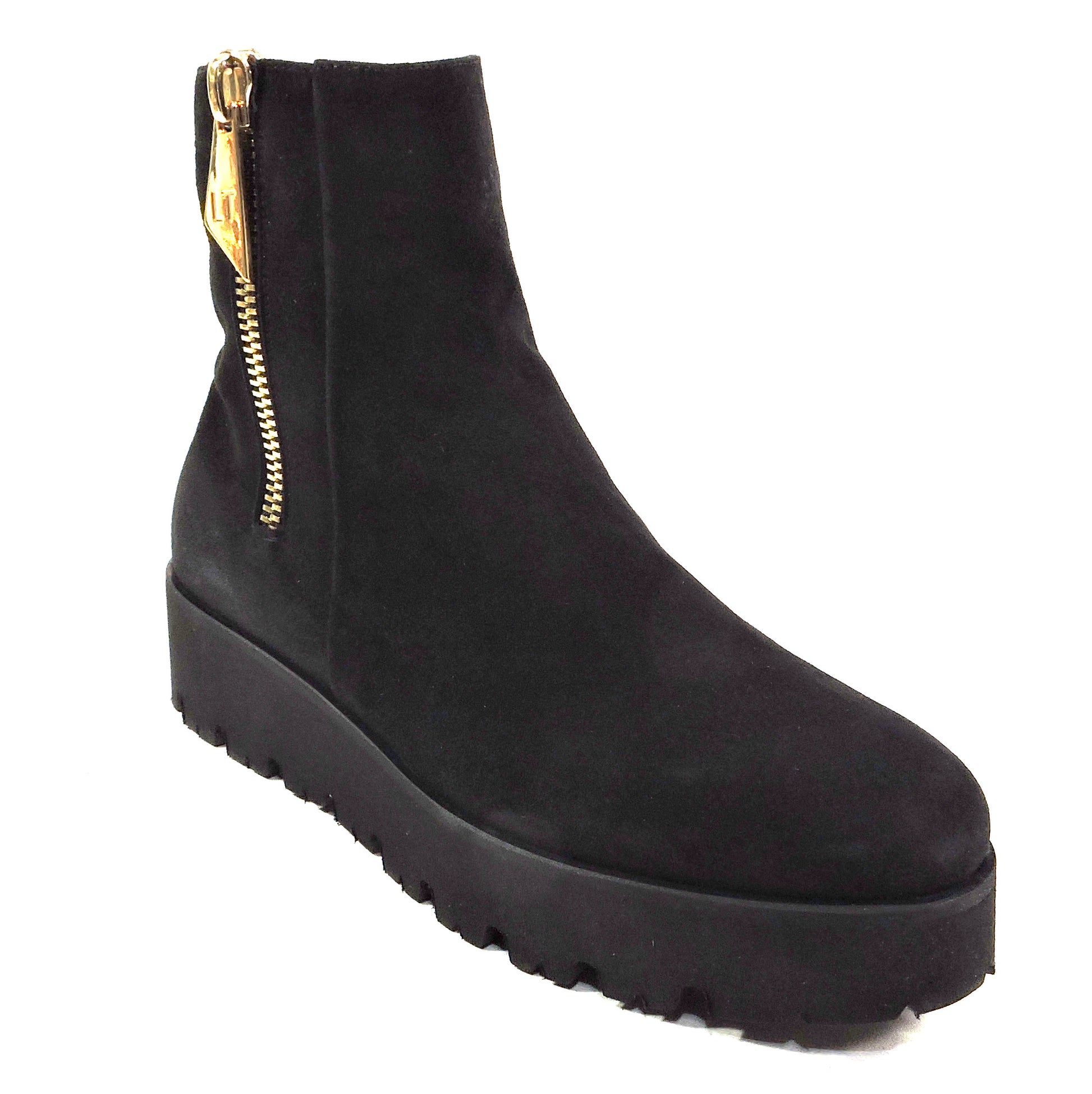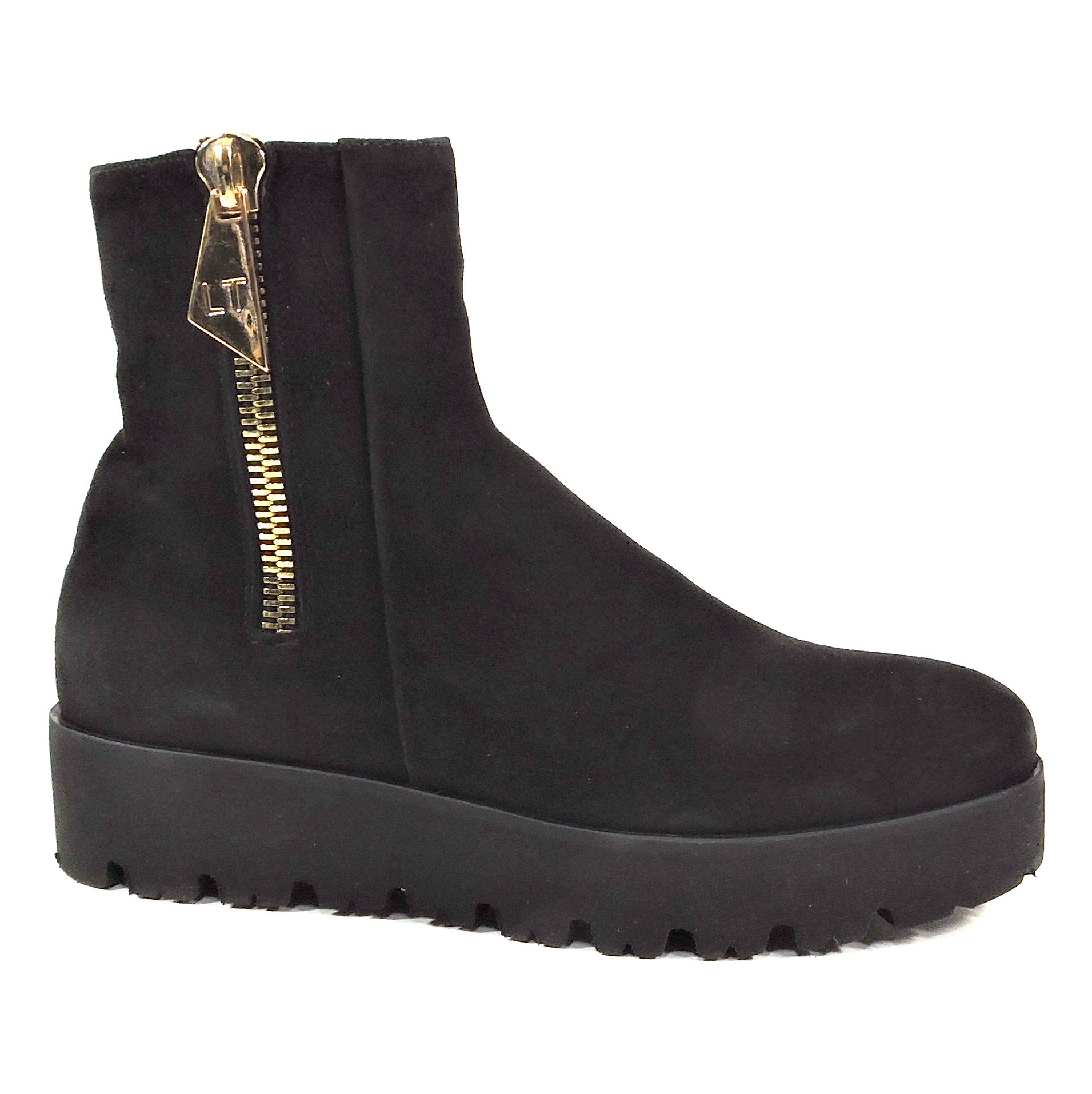 The Luigi Traini women's soft black suede comfort winter flat bootie is a stylish and versatile choice for the colder seasons. Made with high-quality materials and a comfortable design, these ankle boots feature a closed toe, zip closure, and a low heel for added comfort. The solid black color and sleek bootie style make them perfect for casual occasions, while the insole and lining are made of fabric for added comfort and breathability. Crafted in Italy, these boots are sure to add a touch of luxury and style to your winter wardrobe.