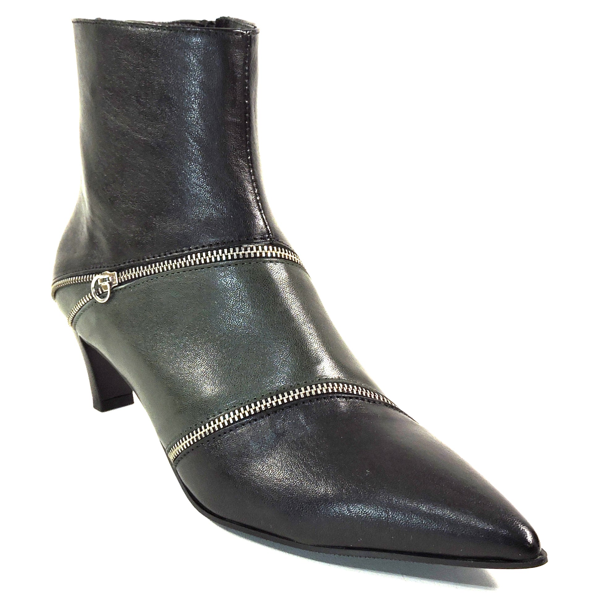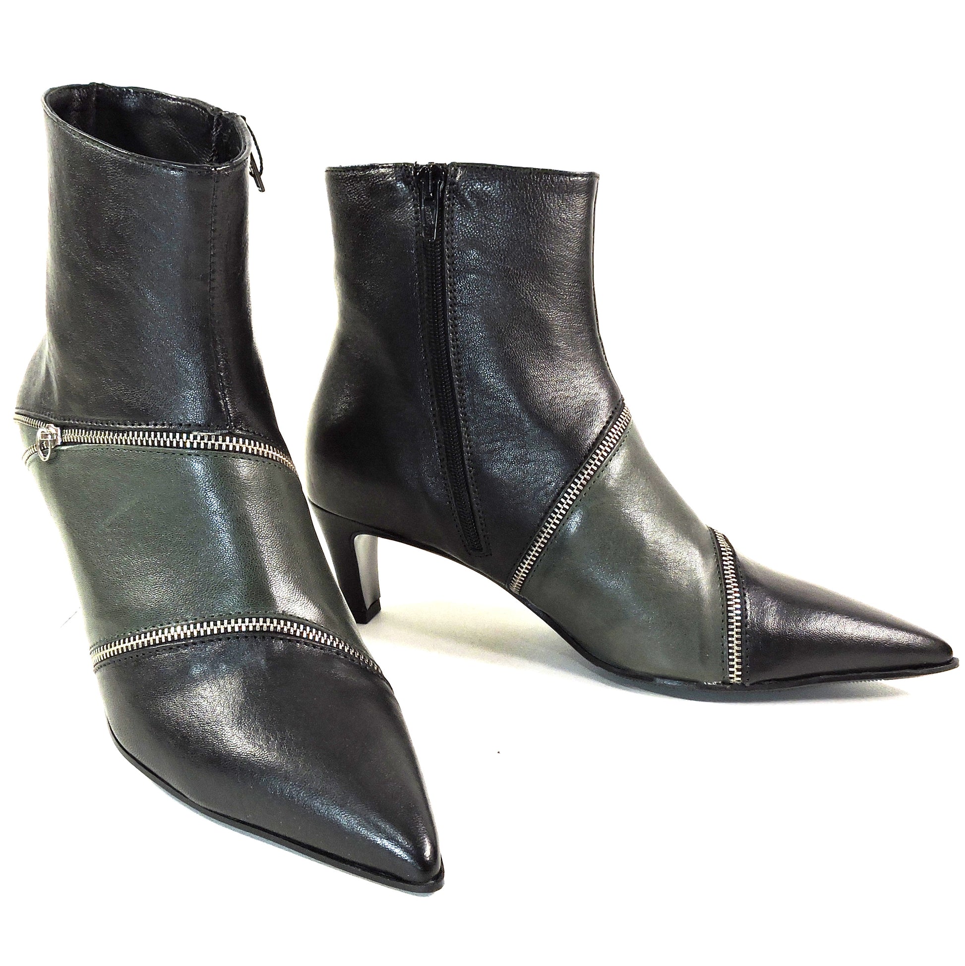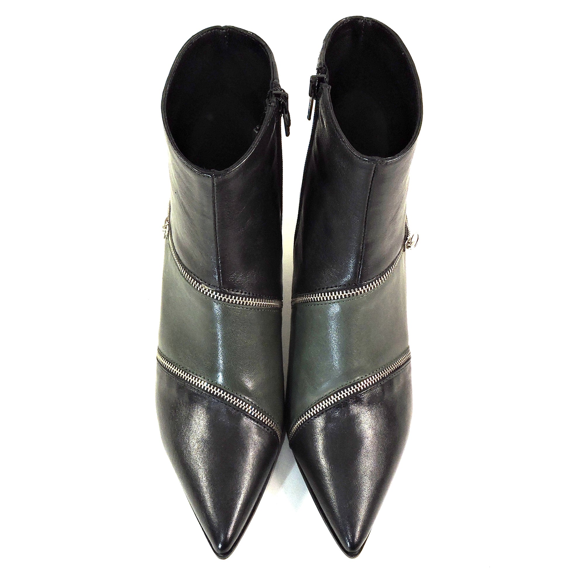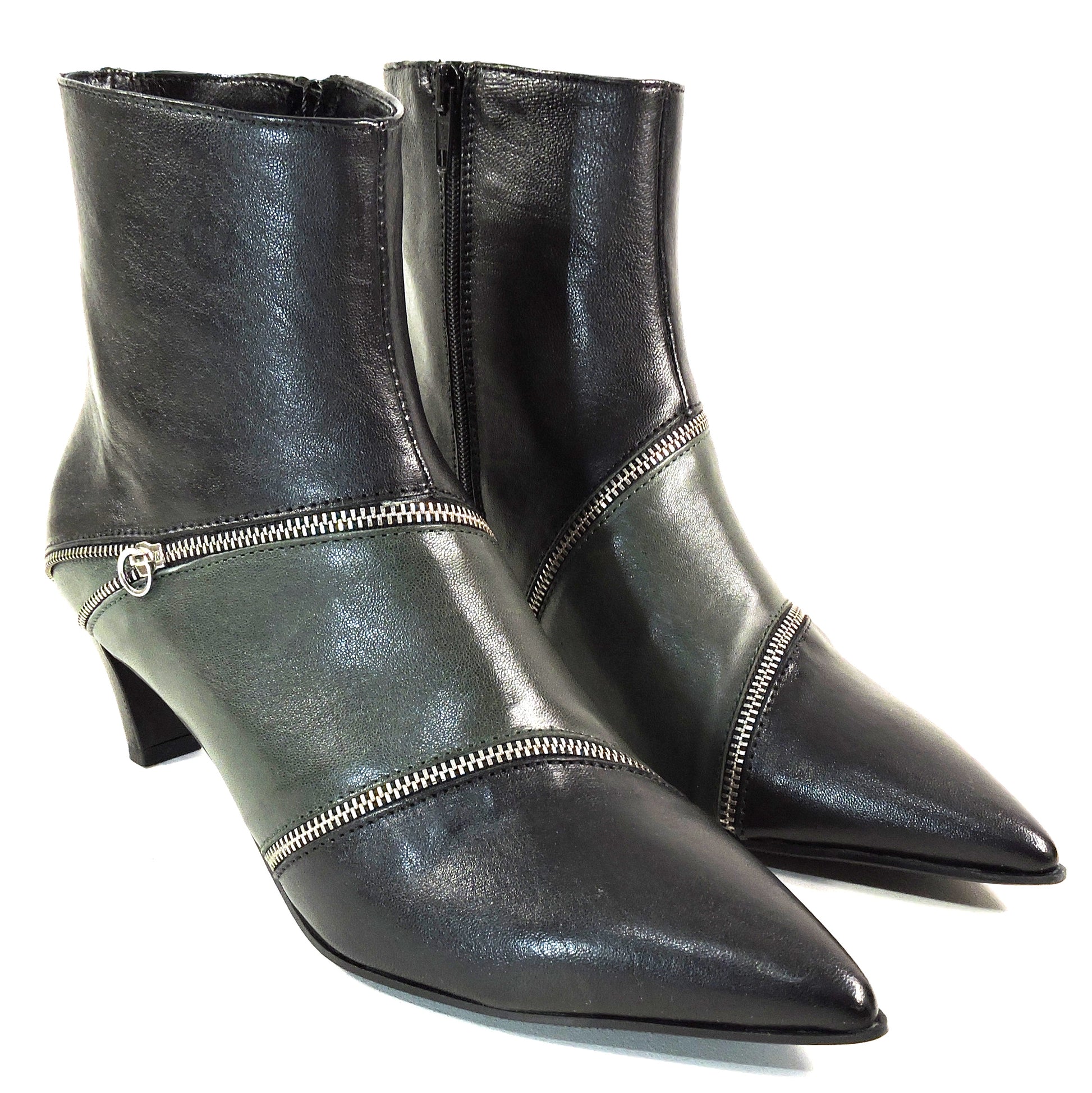 Step into sophisticated style with these exquisite Italian-crafted ankle booties. The soft green leather construction offers both elegance and comfort, while the distinctive zipper detailing adds a contemporary edge to the classic silhouette. These pointed-toe boots feature a perfectly balanced kitten heel that provides just the right height for both style and walkability. The sleek design is enhanced by multiple decorative silver zippers that wrap around the boot shaft, creating an eye-catching pattern that elevates any outfit. The boots' streamlined shape makes them versatile enough to pair with everything from tailored pants to flowing dresses. The pointed toe elongates the leg while maintaining comfort, and the quality craftsmanship ensures durability. These NAPOLEONI boots represent the perfect fusion of Italian design sensibility with modern fashion aesthetics, making them an ideal choice for the fashion-conscious woman who refuses to compromise on comfort or style. EU sizes: 38, 39, 40, 41. Made in Italy